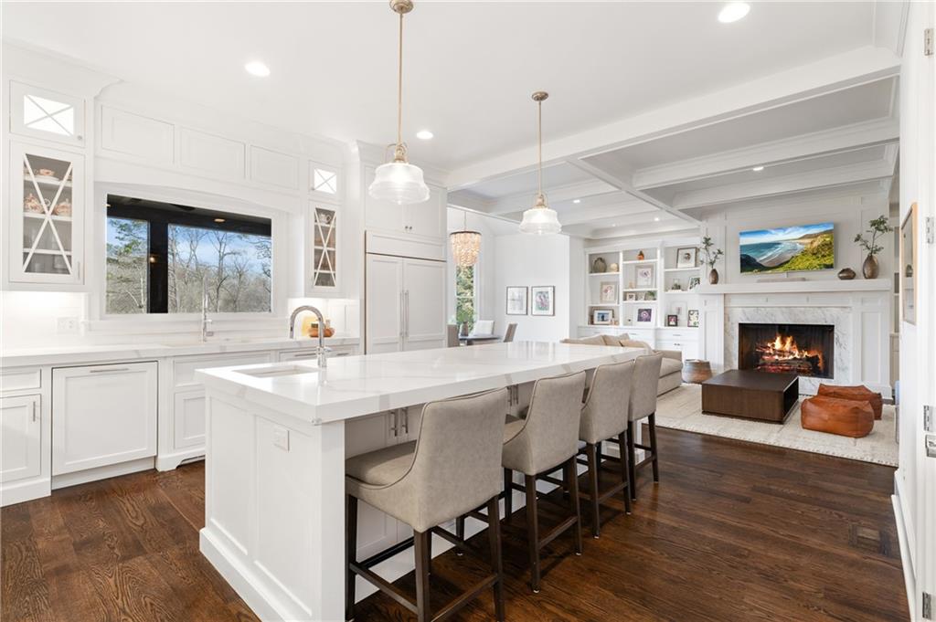 The heart of the home is the grand family room, featuring a coffered ceiling, built-in shelving, and a stunning fireplace, perfect for relaxing or entertaining. The formal dining room adds timeless elegance, while the chef's dream kitchen boasts a massive island, white cabinetry, white quartz countertops, a breakfast bar, a breakfast nook, and a butler's pantry. A cozy den with a striking stone fireplace offers additional space to unwind.